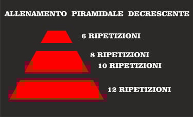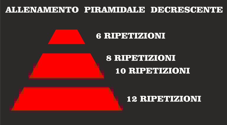 Si inizia con carichi pesanti e un basso numero di ripetizioni, diminuendo gradualmente il carico e aumentando le ripetizioni ad ogni serie.