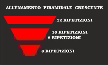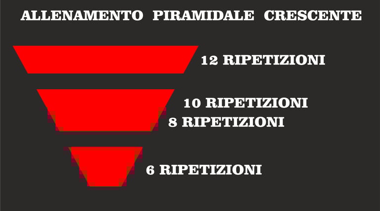 Esempio: 12 ripetizioni con 50 kg, 10-8 ripetizioni con 60 kg, 6 ripetizioni con 70 kg.