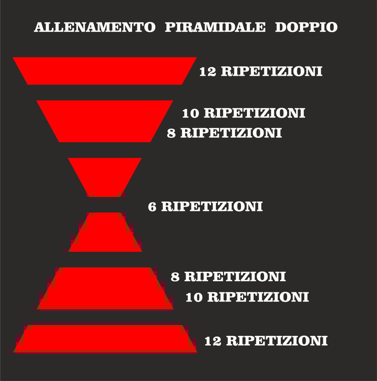 L'allenamento piramidale è una tecnica di allenamento con i pesi in cui si varia il carico e il numero di ripetizioni in modo progressivo, creando una sorta di "piramide" di lavoro. Si parte con un carico leggero e un alto numero di ripetizioni, per poi aumentare gradualmente il carico e diminuire le ripetizioni fino a raggiungere un carico massimo per un basso numero di ripetizioni.