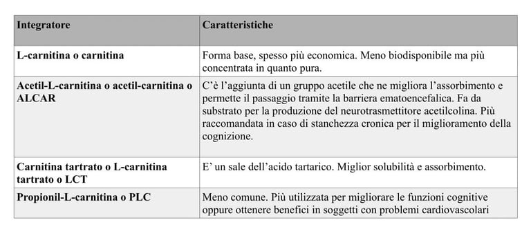 Esistono diverse forme di carnitina, ognuna con caratteristiche specifiche:
