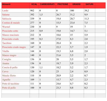 Tabella Calorie Carne