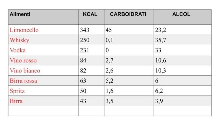 Tabella Calorie Alcolici