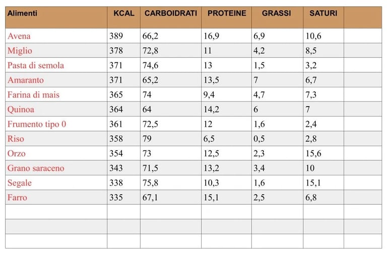 Tabella Calorie Cereali