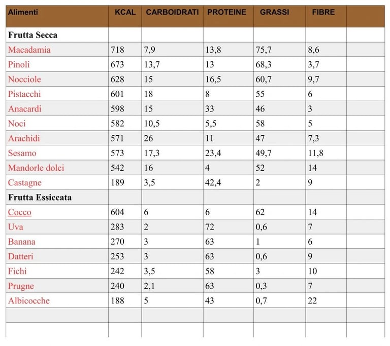 Tabella Calorie Frutta Secca