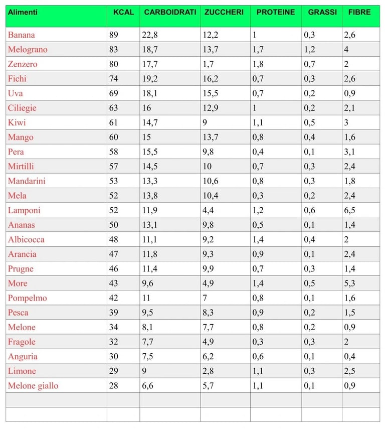 Tabella Calorie Frutta